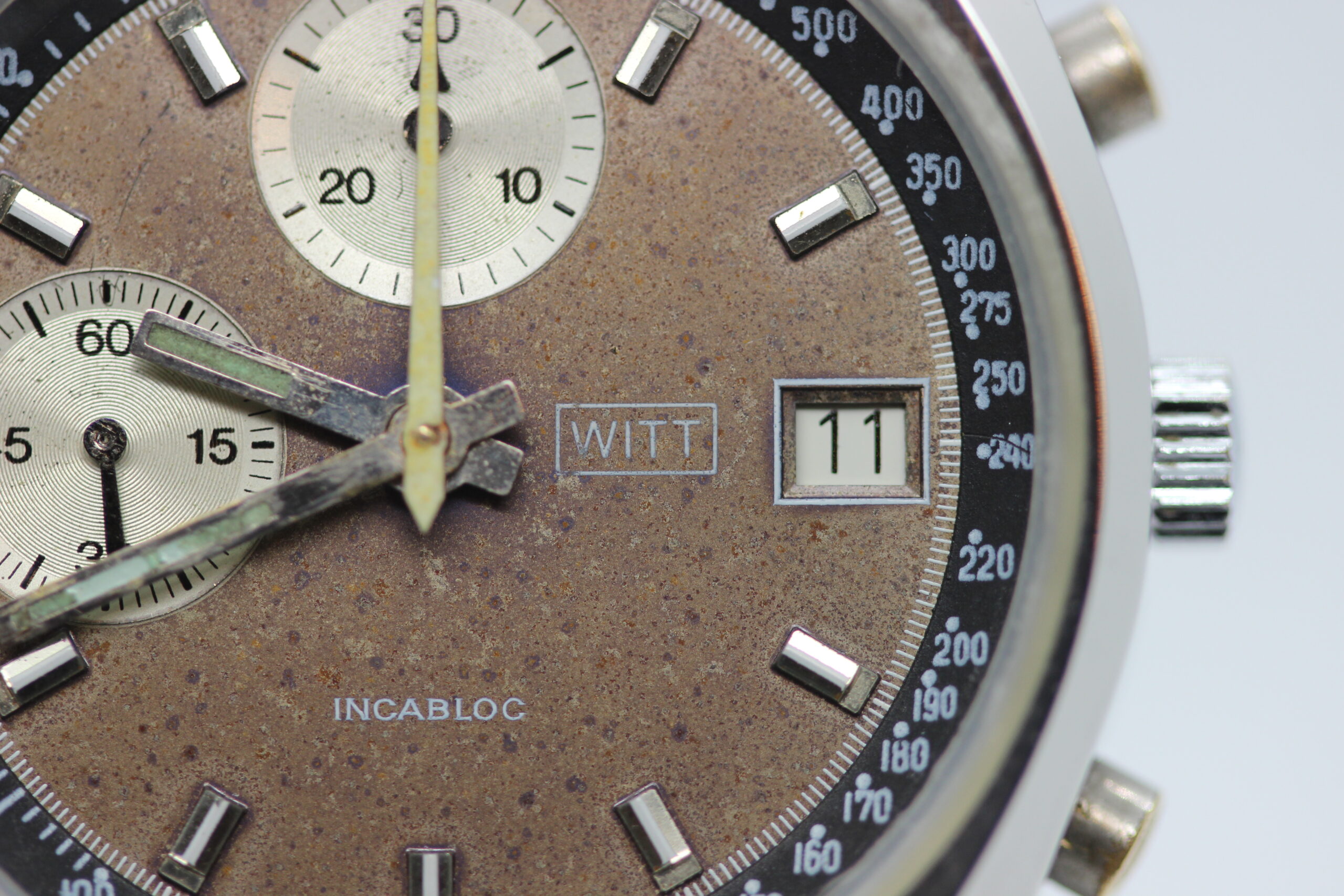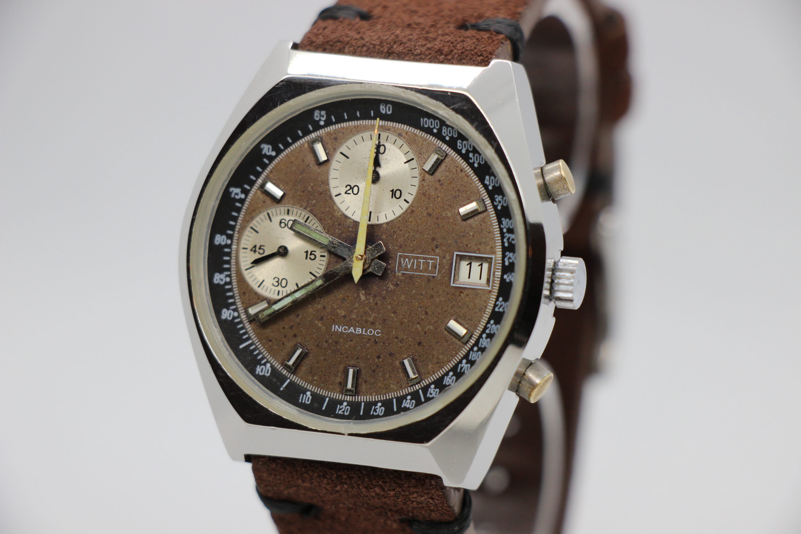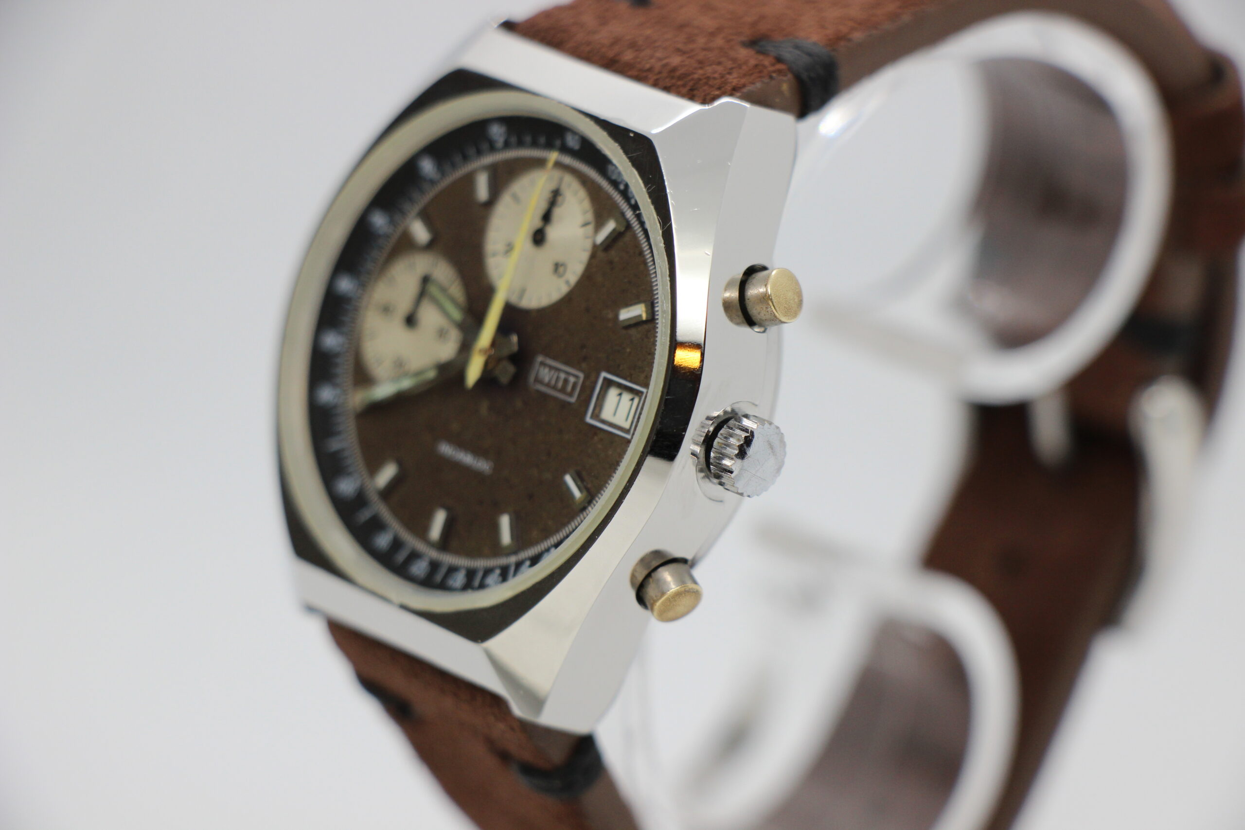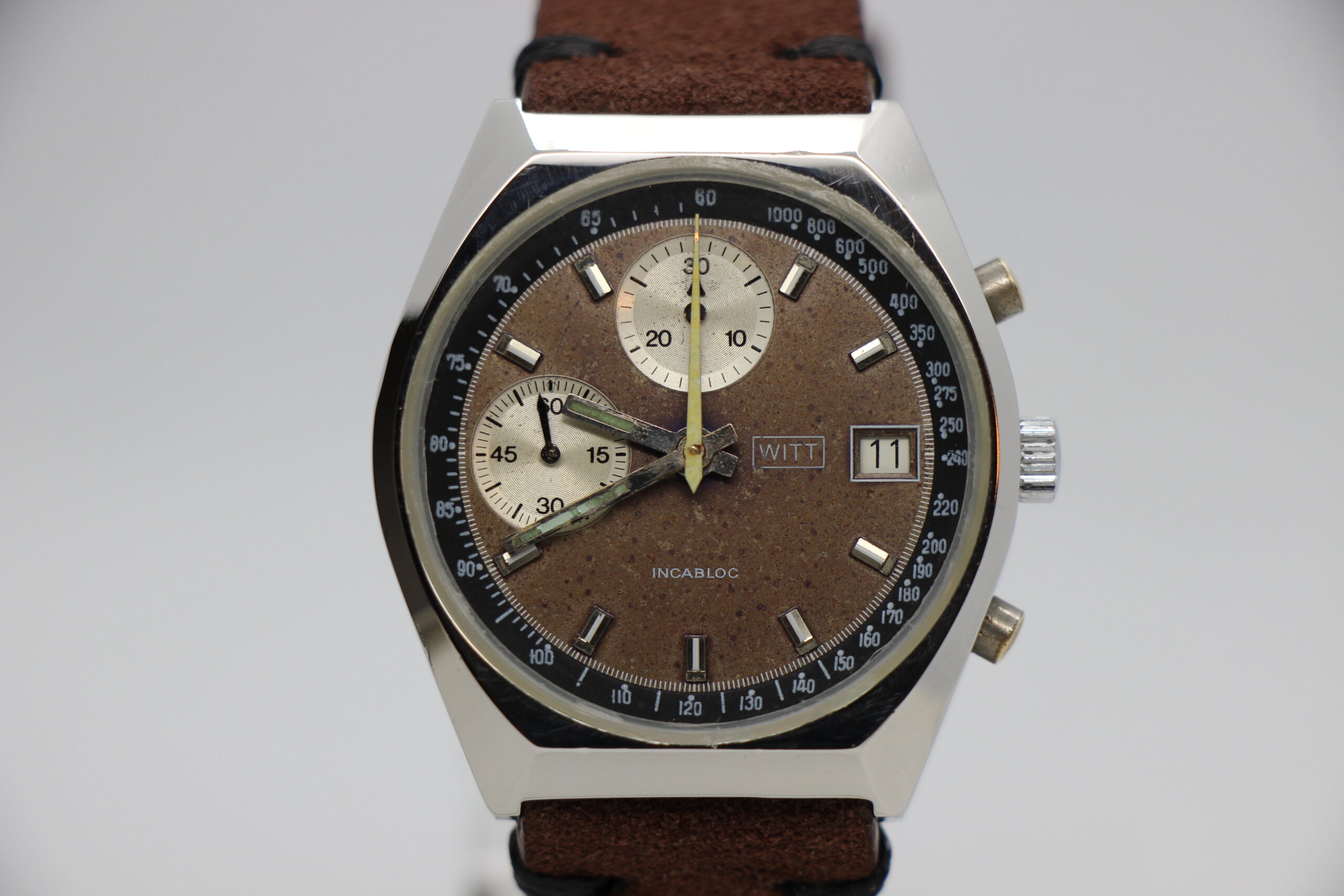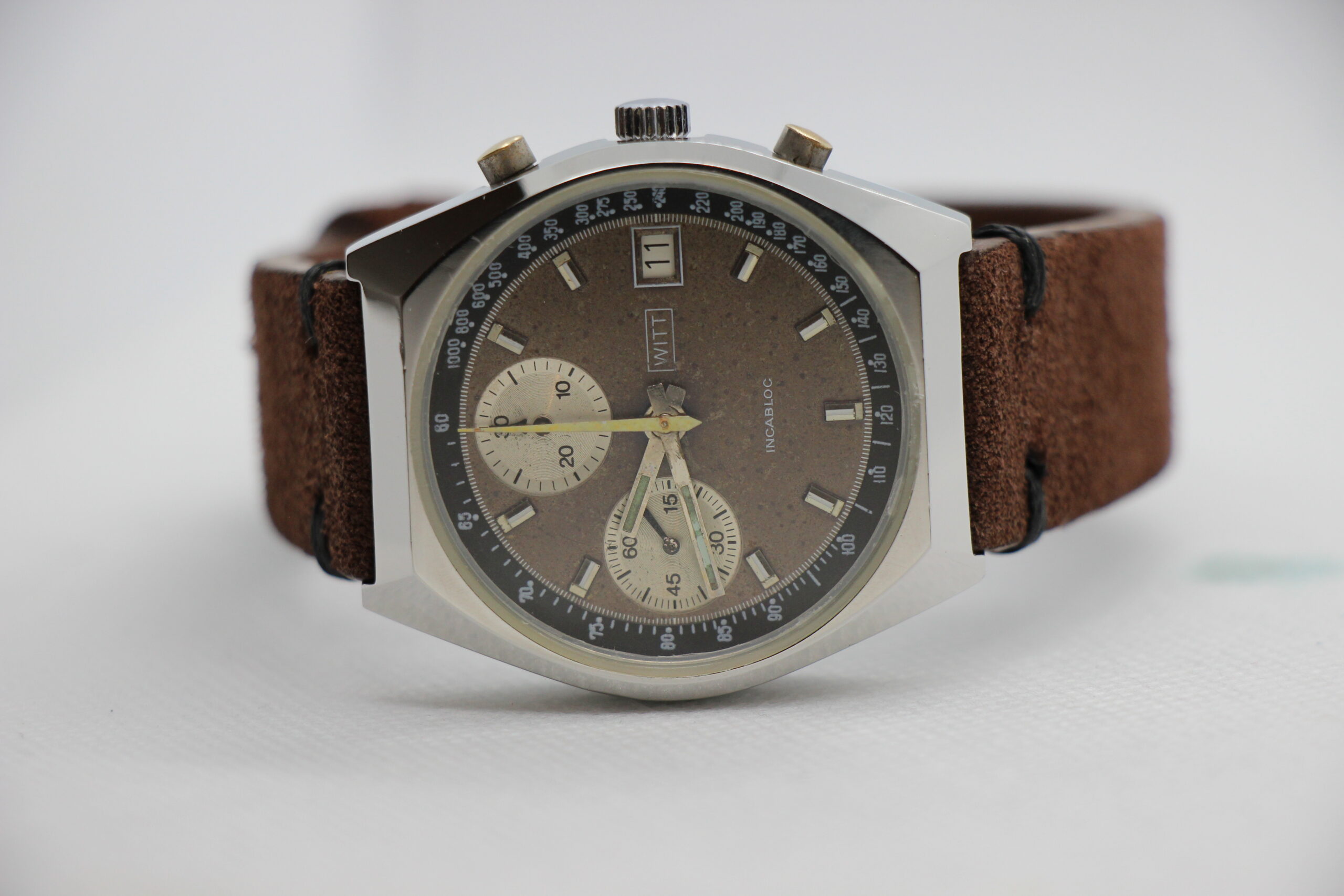 Oplev dette klassiske Witt Chronograph fra 1970’erne, som nu er nyrenoveret og klar til at blive bÃ¥ret med stolthed. Uret drives af det pÃ¥lidelige Valjoux 7765 kaliber, kendt for sin præcision og holdbarhed. Med en diameter pÃ¥ 37 mm og en horn-til-horn længde pÃ¥ 41 mm, passer det perfekt til de fleste hÃ¥ndled.