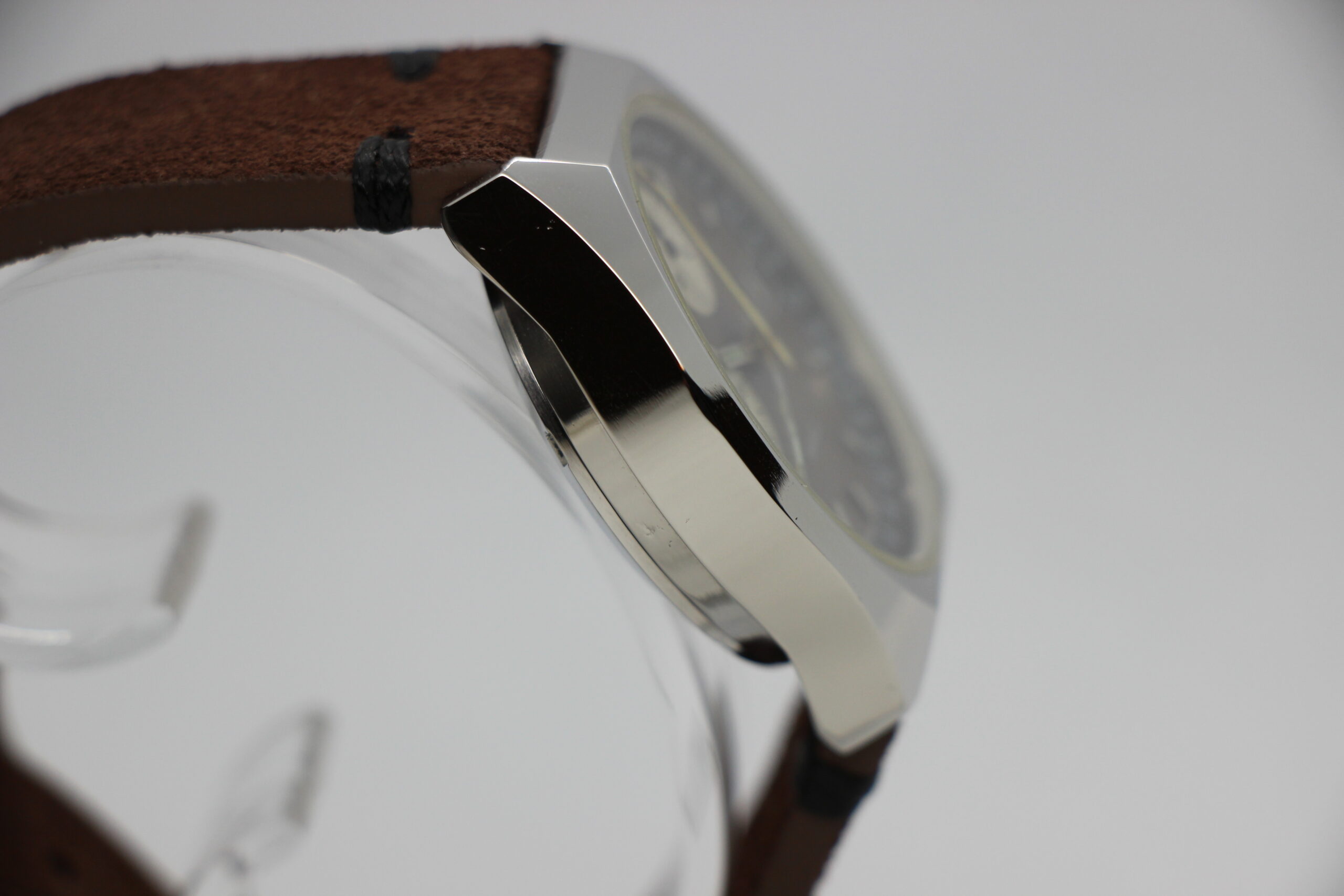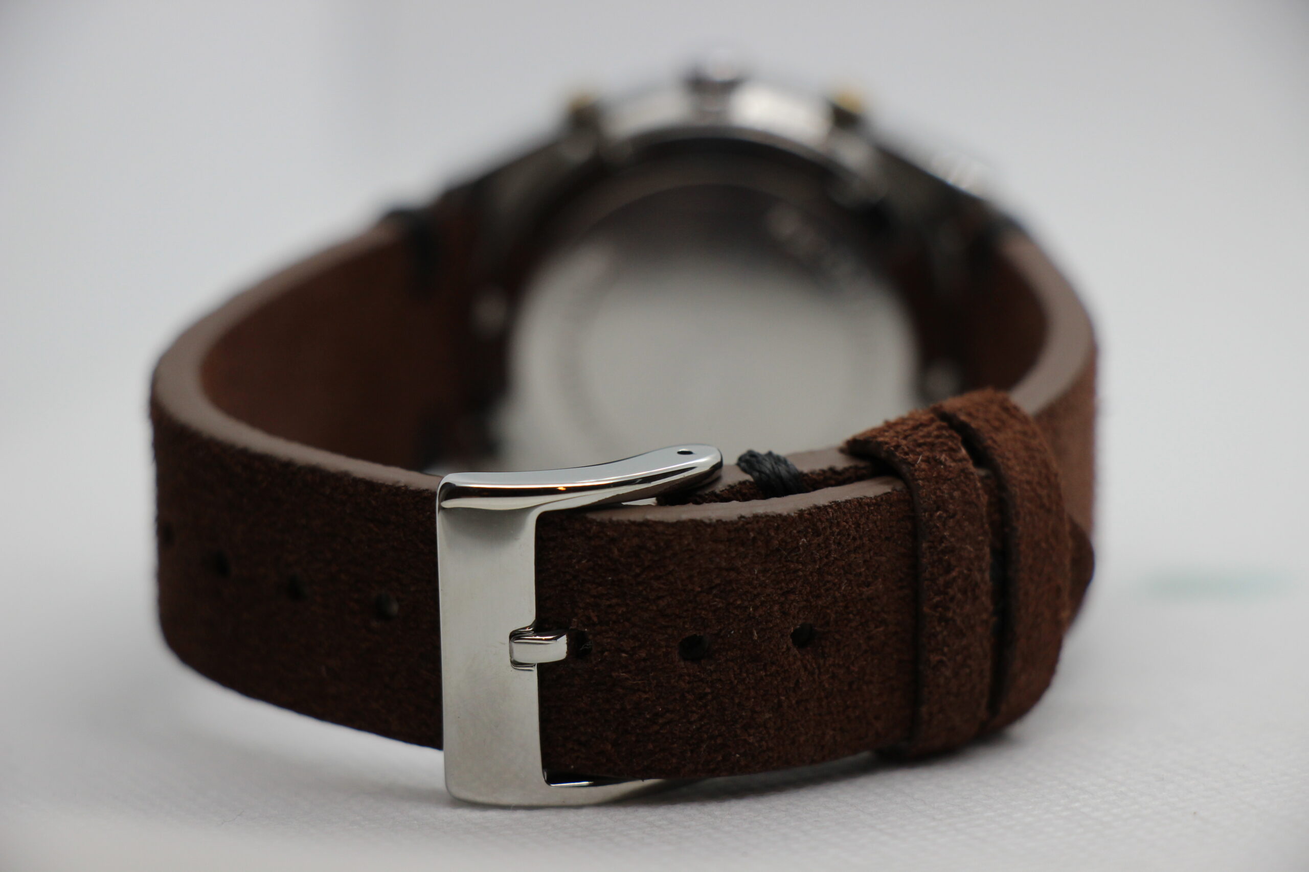 Uret kommer på en helt ny brun ruskindsrem der passer godt til den flotte brune skive.
