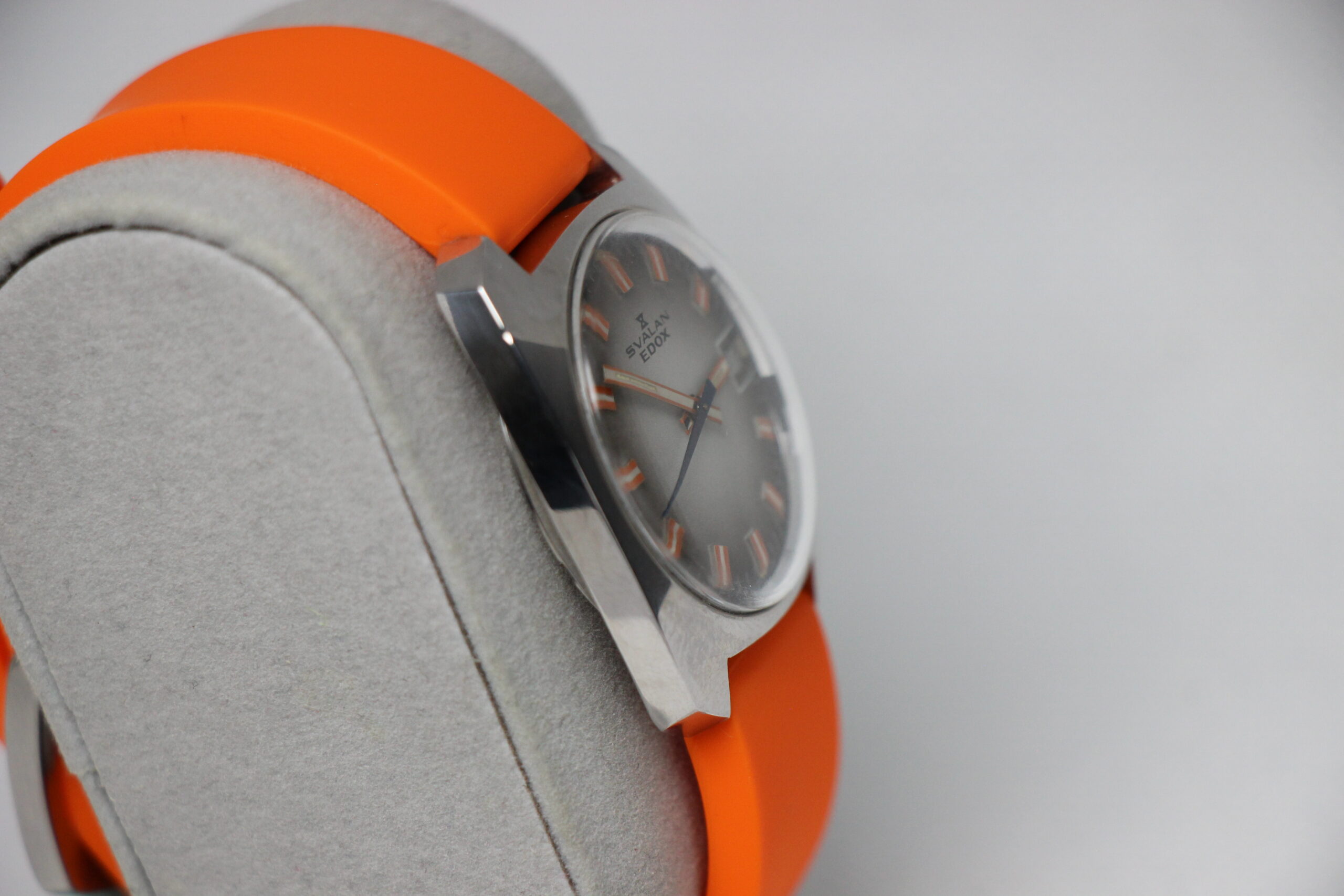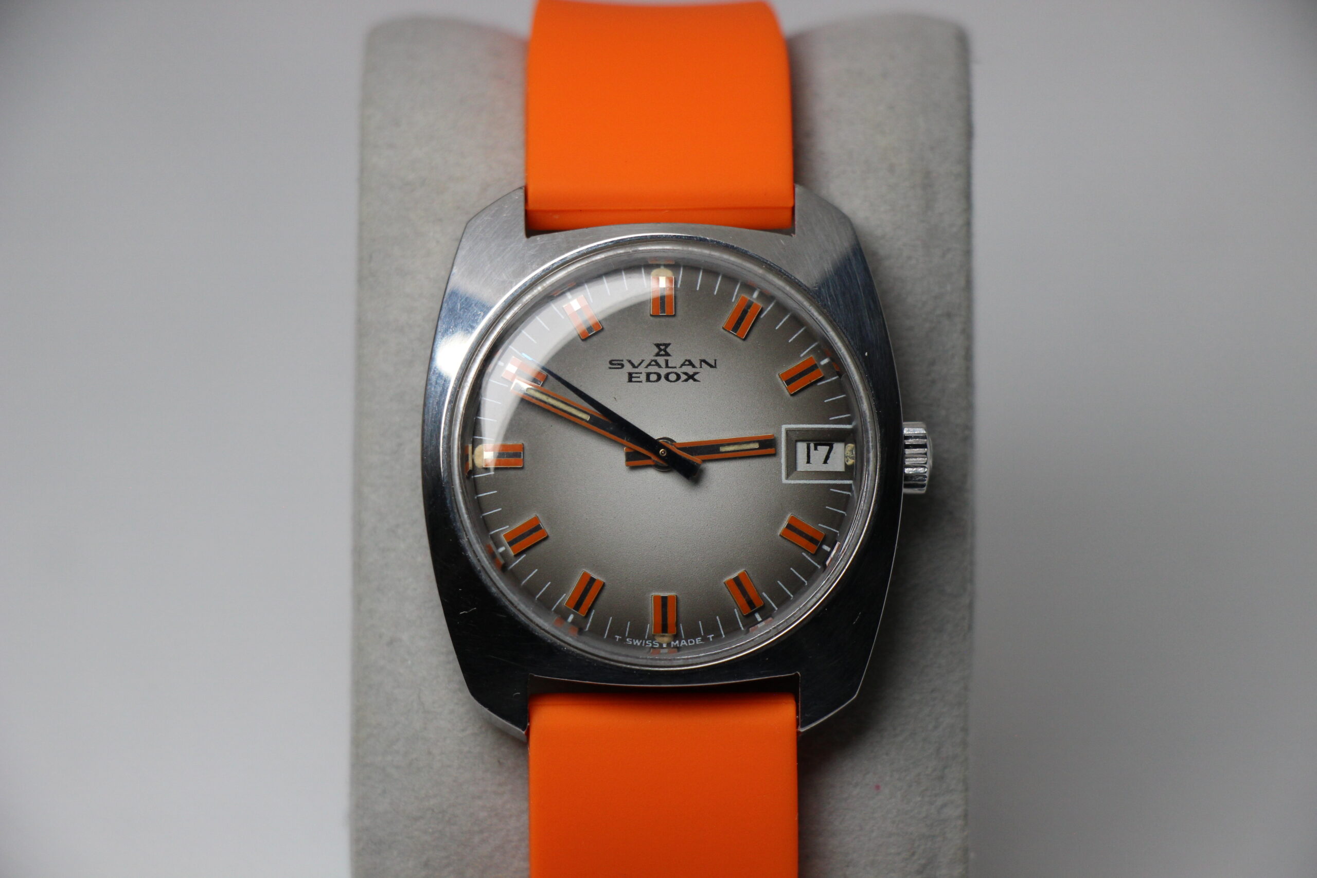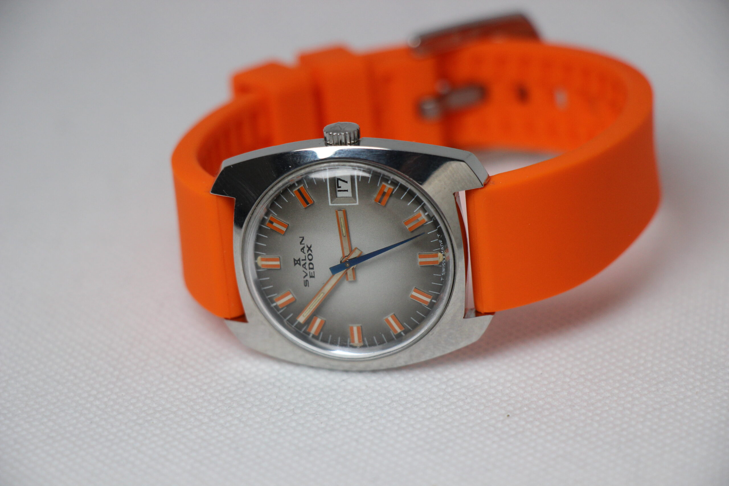 Beskrivelse: Ny-serviceret vintage EDOX Svalan Uret er med manuel optræk. Det kommer på en flot ny orange gummi rem.
