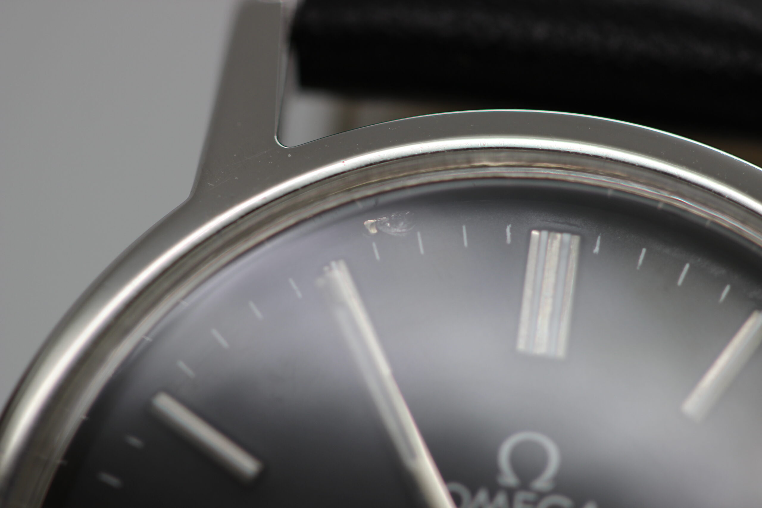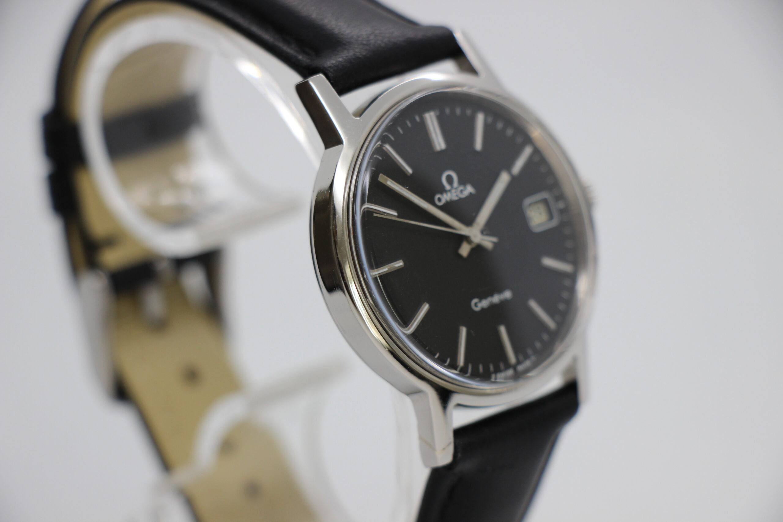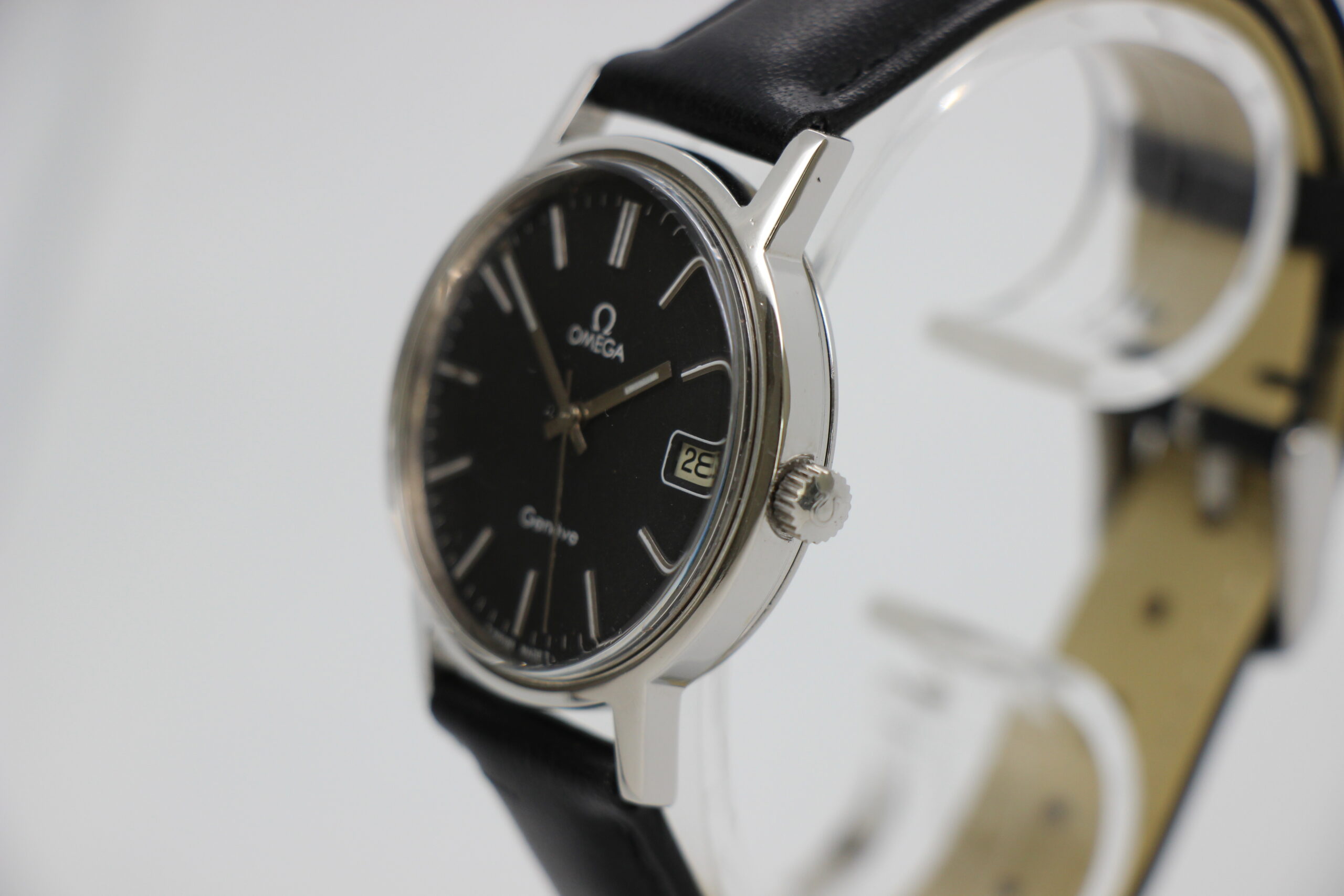 Elegante Omega GenĂ©ve ur fra 1977, som er nyrenoveret for at genskabe sin oprindelige skønhed. Uret har et manuelt urværk (Cal. 1030) og en diameter pĂ¥ 35 mm – perfekt til enhver hĂ¥ndled. Den sorte skive har en lille skade ved kl. 11.00, men den er ikke stor. Uret har ogsĂ¥ en lille reparation pĂ¥ det ene horn, men fungerer glimrende og vil med garanti vække beundring.