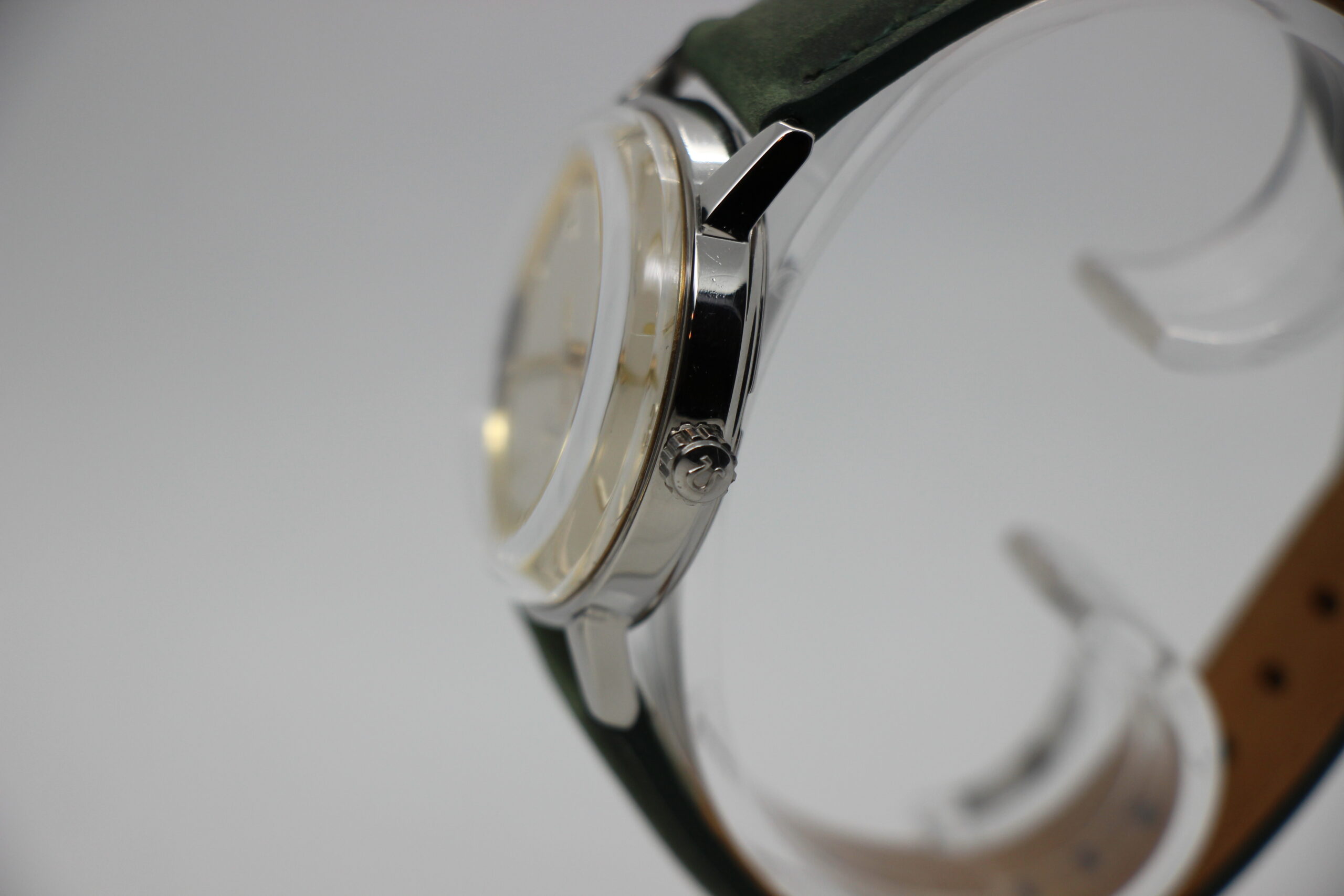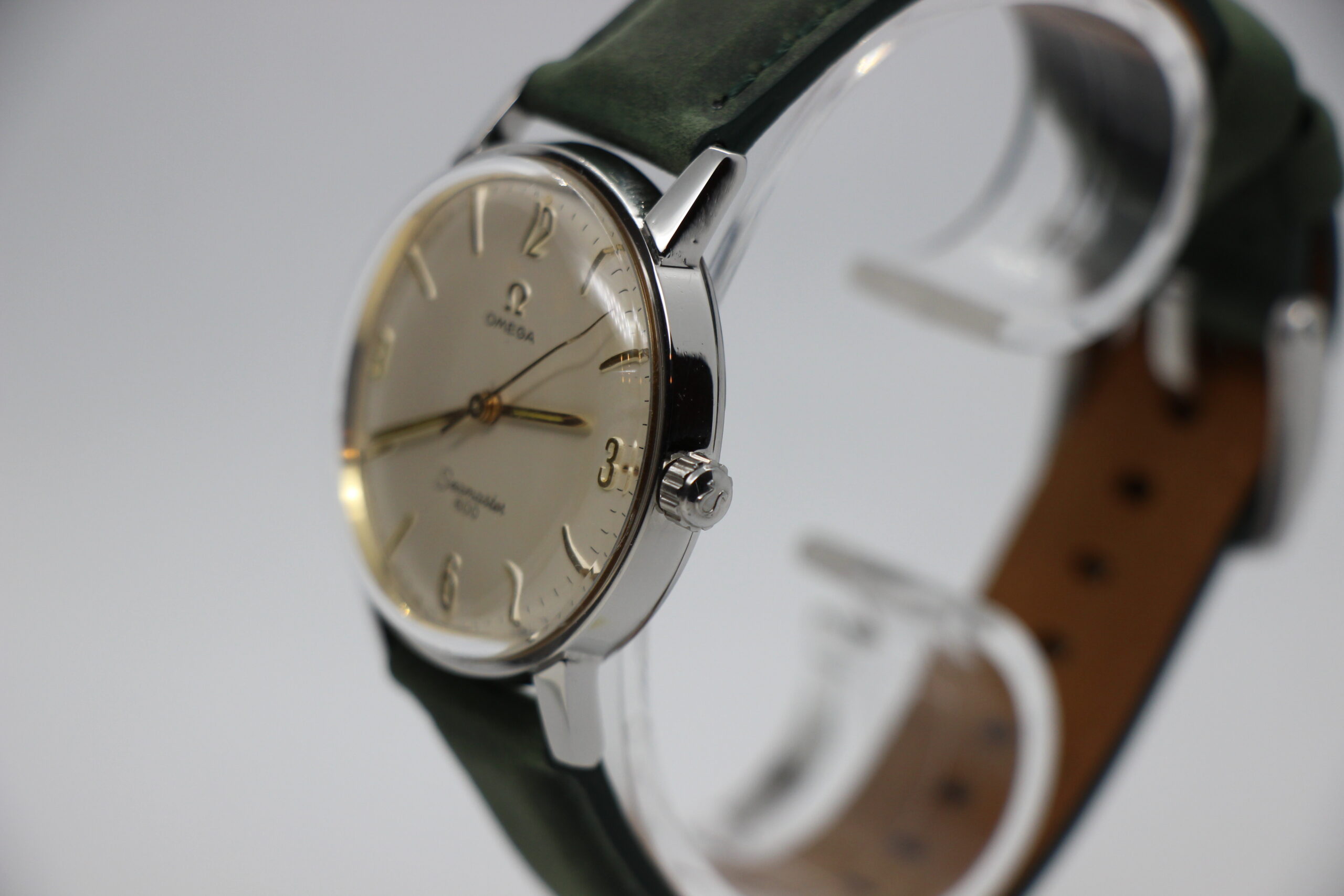 Dette Omega Seamaster 600 er en klassisk skønhed fra 1960’erne, der nu er nyrenoveret og klar til sin næste ejer. Uret har et manuelt urværk (Cal. 601) og en diameter pÃ¥ 34 mm, hvilket gør det til en ideel størrelse for bÃ¥de mænd og kvinder. Uret bliver leveret med en ny grøn læderrem som dog kan skiftes til en mere low key mørk brun læderrem hvis ønskes. Uret kan en meget velholdt skive med numre 3,6,9 og 12 som giver lidt ekstra til urets look.