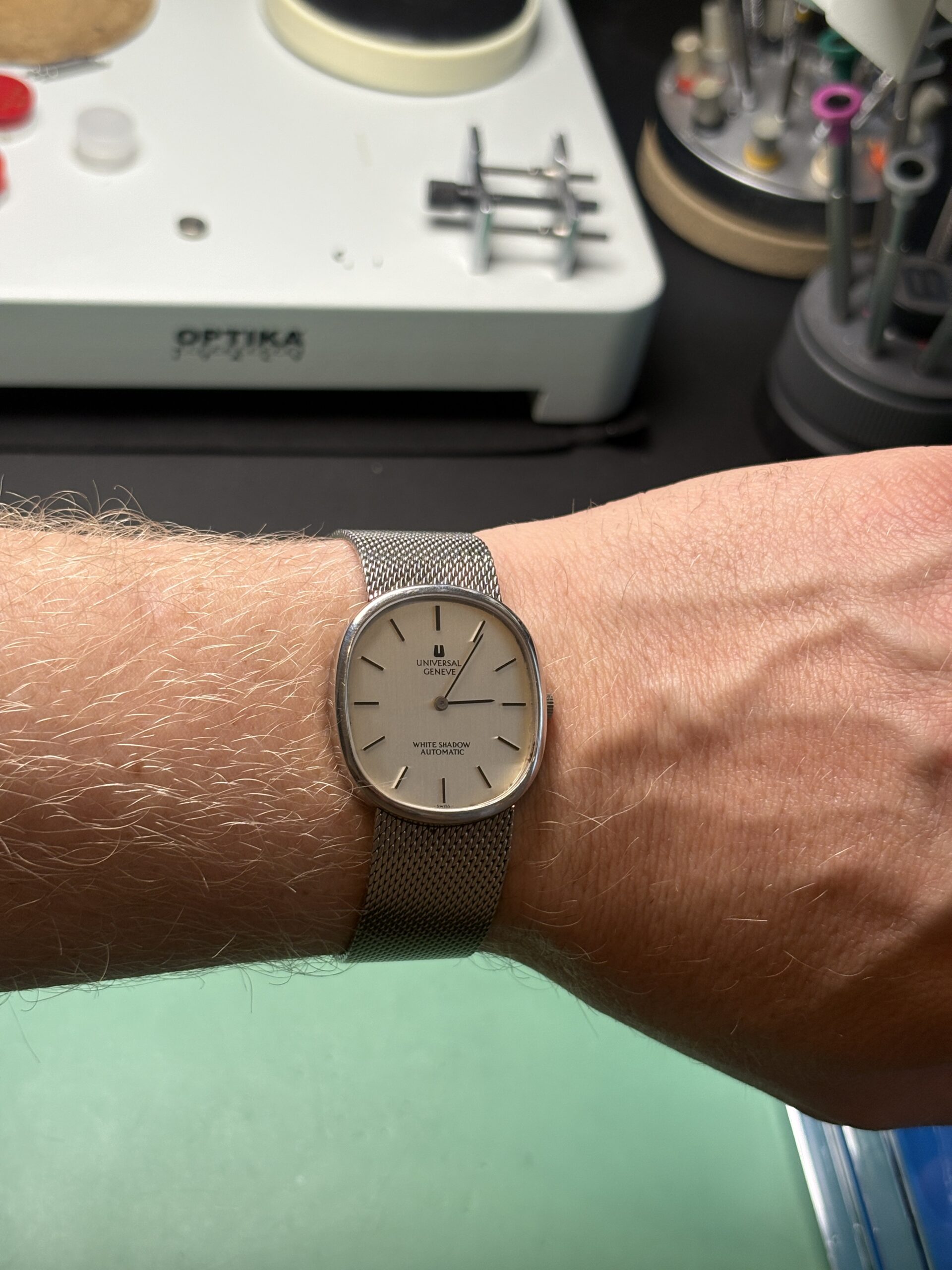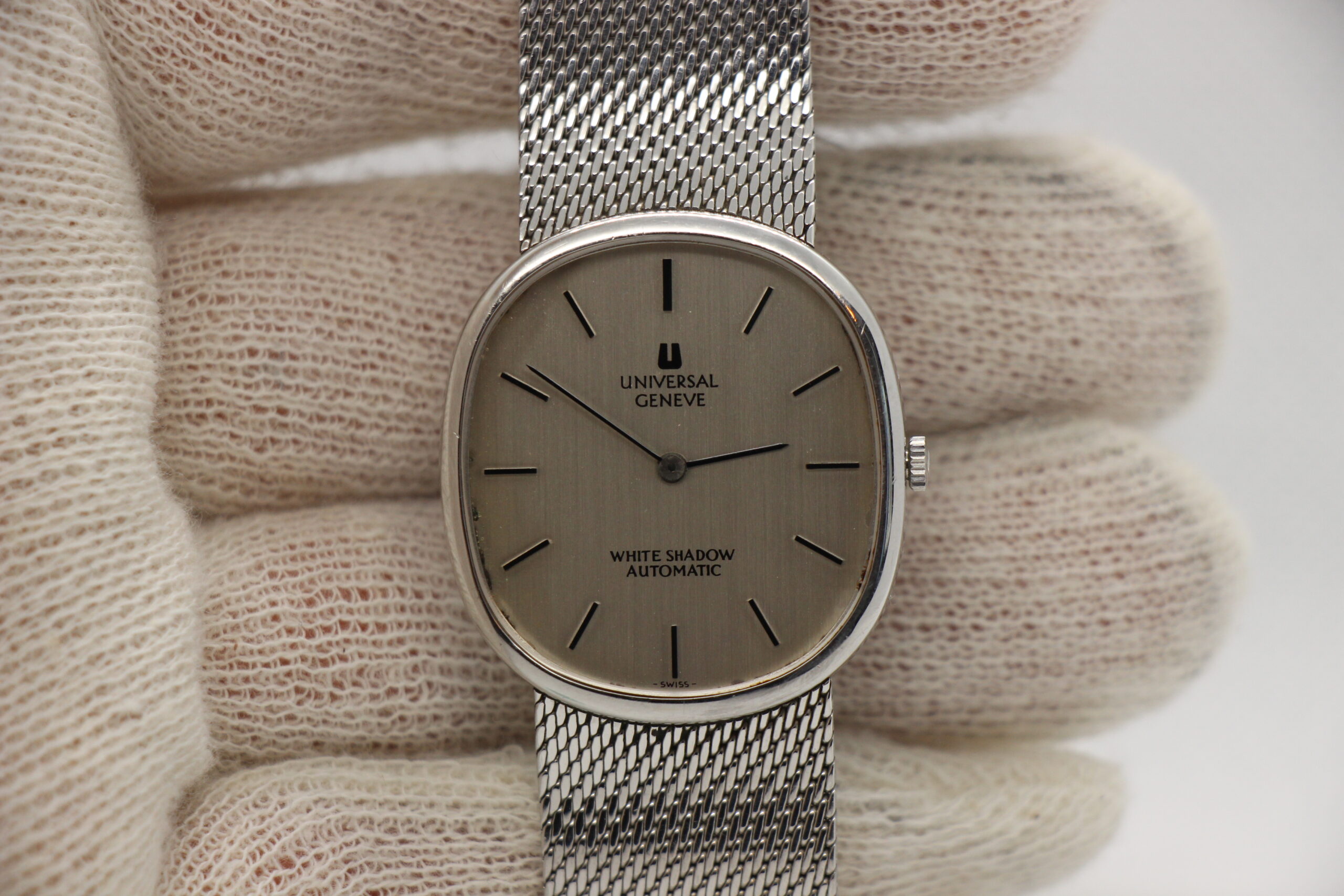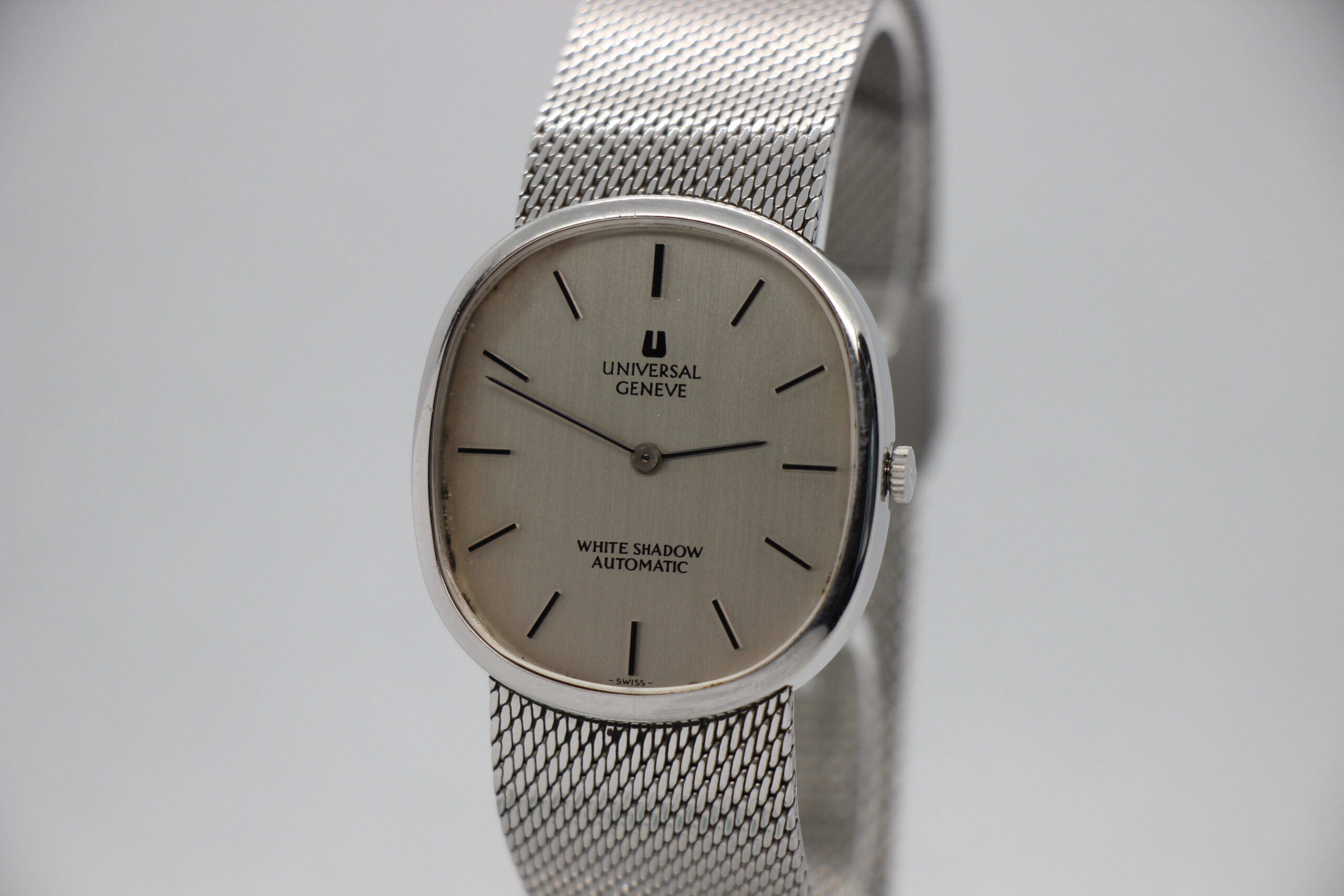 Dette elegante White Shadow fra Universal Genève er fra 1967 og er designet af Gérald Genta, som senere kom til Patek Philippe og Audemars Piguet, hvor han blandt andet designede Royal Oak og Nautilus. Nogle vil sige, at han er vor tids største urdesigner.