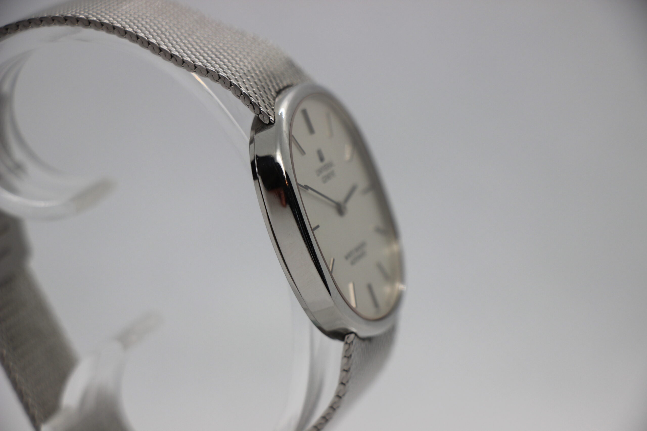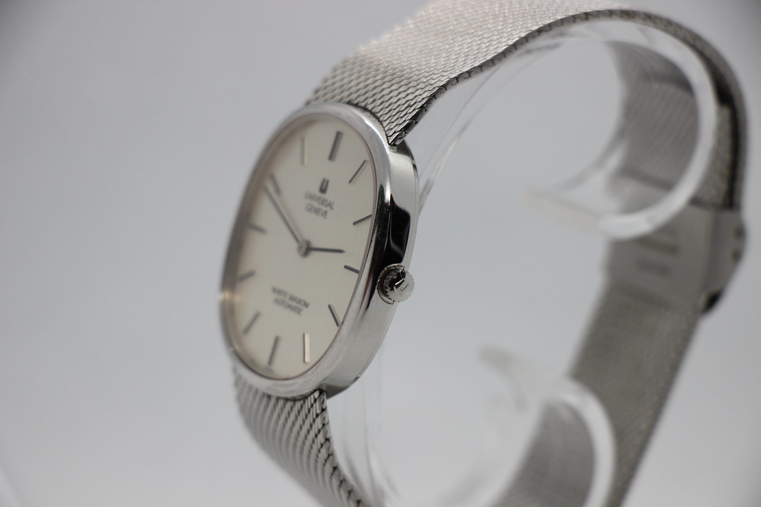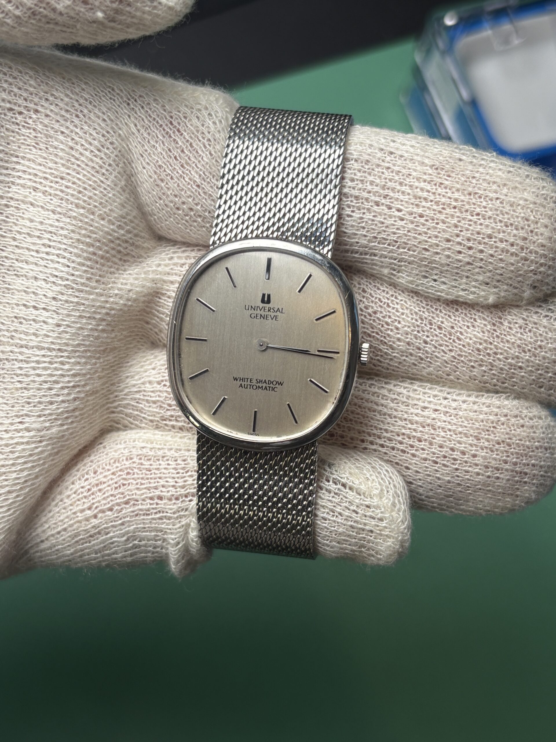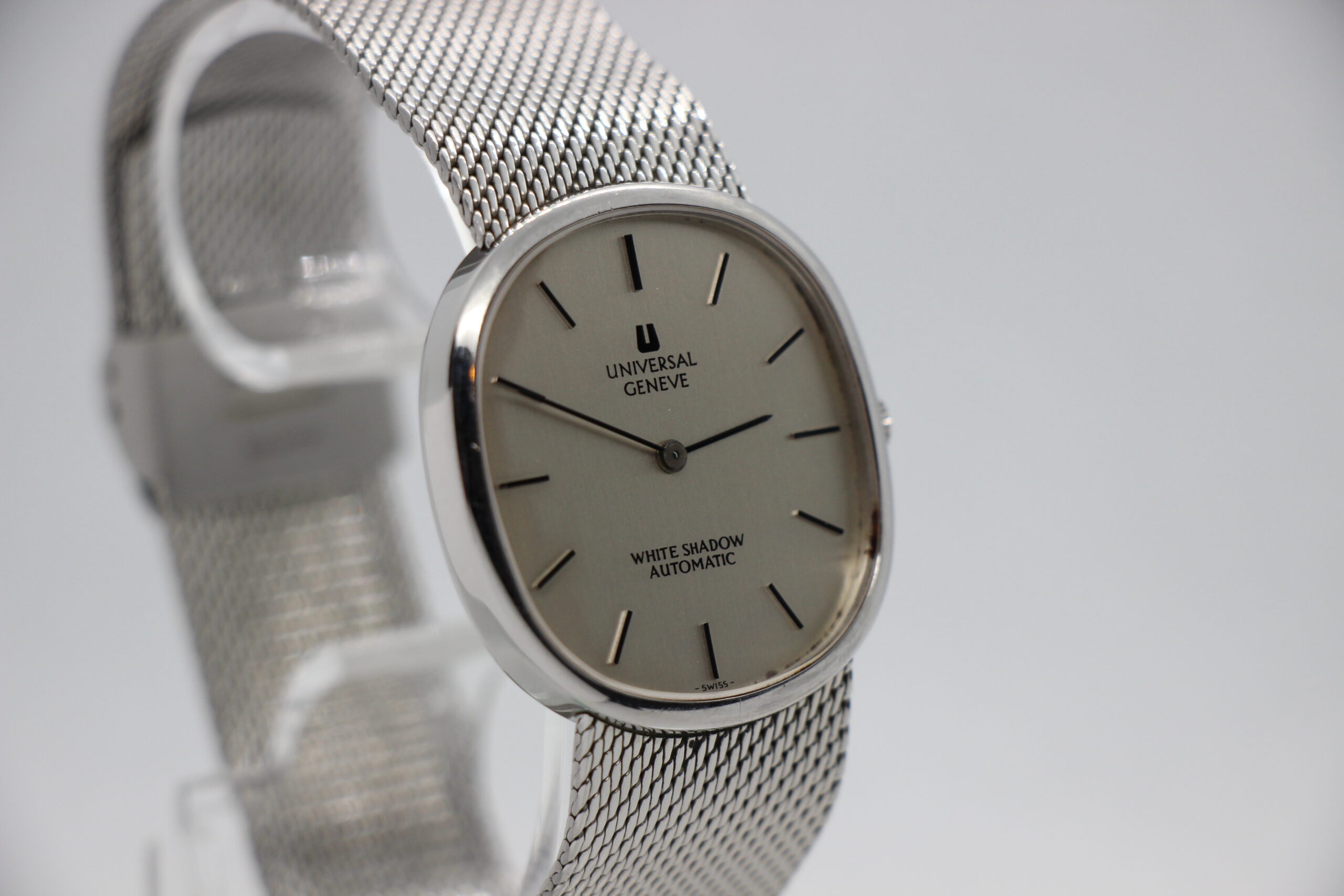 Dette elegante White Shadow fra Universal Genève er fra 1967 og er designet af Gérald Genta, som senere kom til Patek Philippe og Audemars Piguet, hvor han blandt andet designede Royal Oak og Nautilus. Nogle vil sige, at han er vor tids største urdesigner.