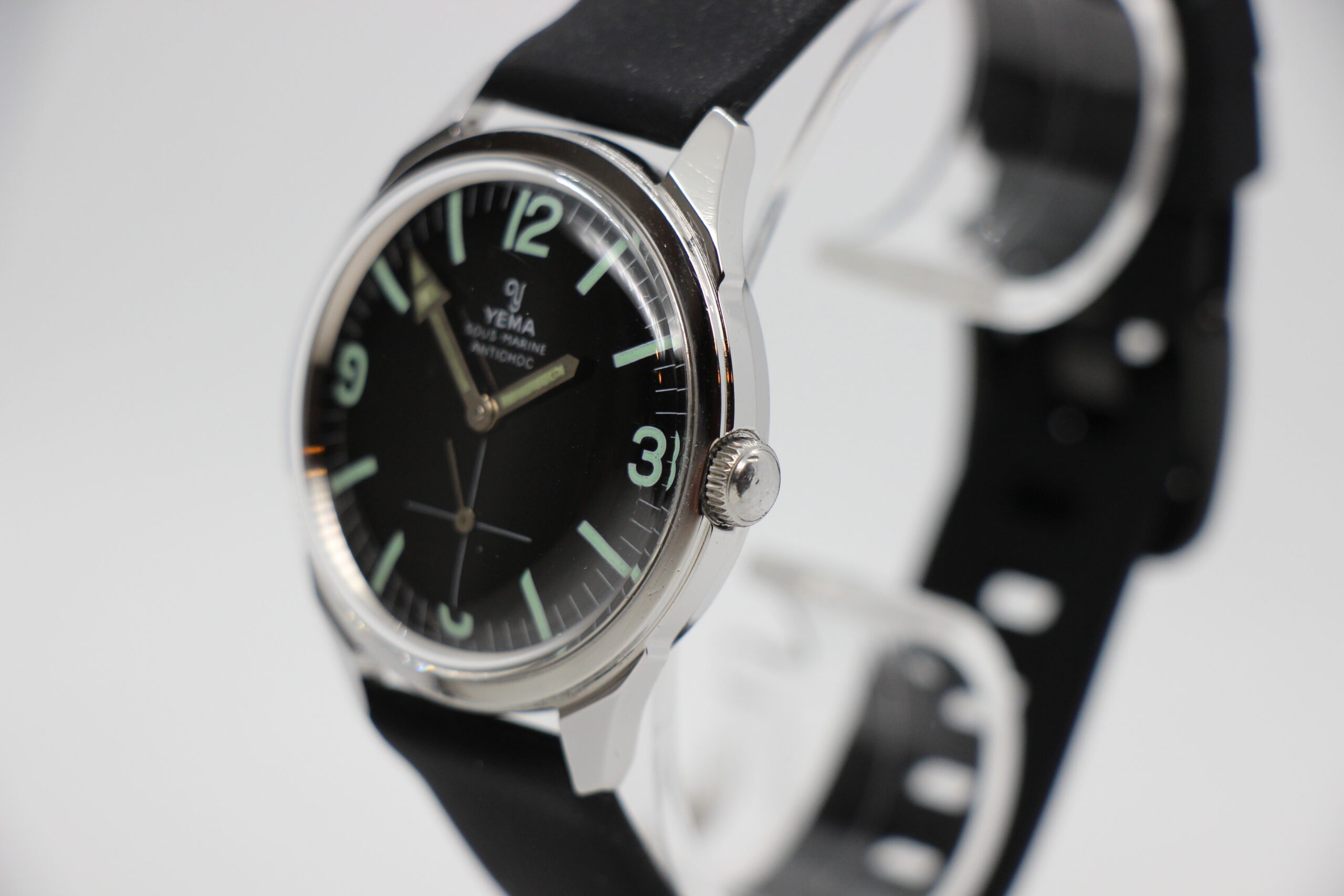 Smukt Yema Sous Marine fra 1970’erne. Uret er nyrenoveret og kommer med en flot sort skive, som virkelig fremhæver dets vintage charme. Med en diameter på 35 mm og en horn-til-horn længde på 41 mm, er det både kompakt og stilfuldt. Det har fået en helt ny sort gummirem, hvilket gør det klar til dagligt brug.